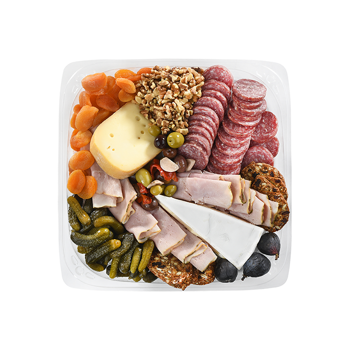 Our French-style selection includes rosemary ham, salami, triple cream brie and OKA cheese, paired with cornichons, olives, dried fruits, nuts and crisps.