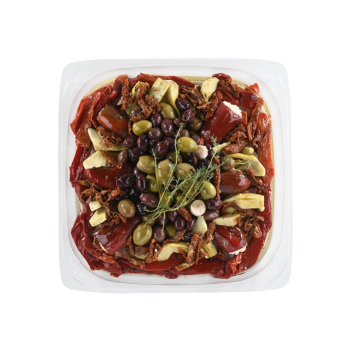 A tasty antipasto assortment which includes Kalamata, Castelvetrano and stuffed olives, marinated artichoke hearts, roasted red peppers, sundried tomatoes and stuffed jalapenos.