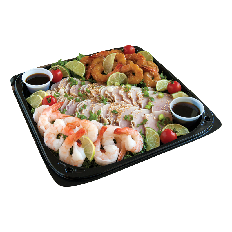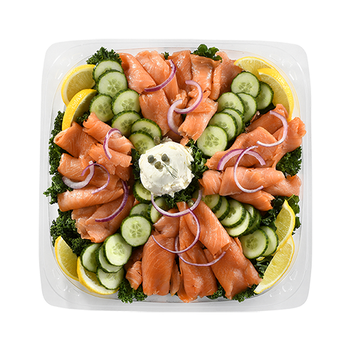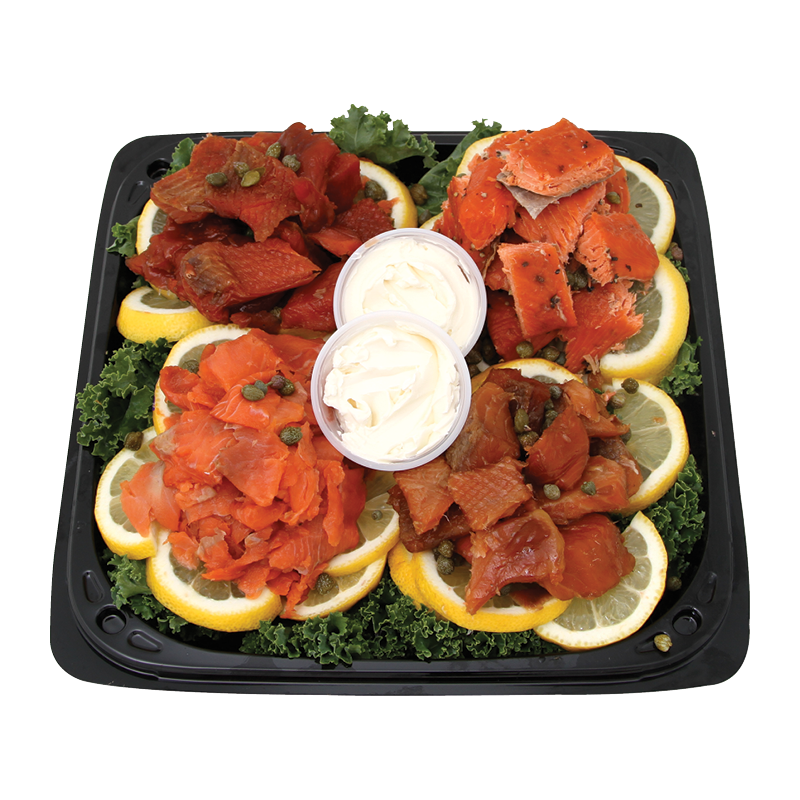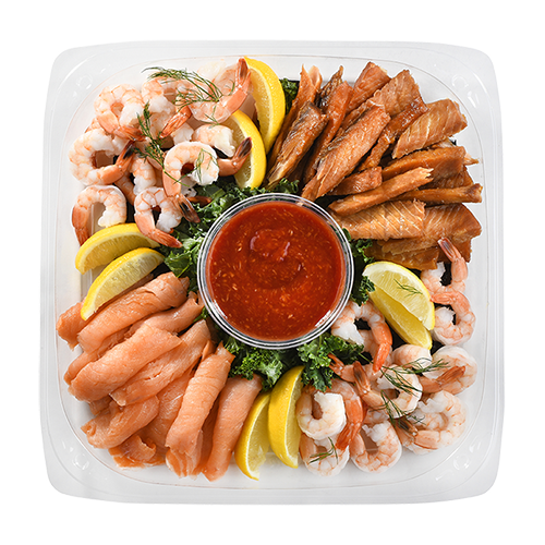 Make any gathering special. Shrimp, candied hot-smoked Atlantic salmon and smoked salmon served with seafood cocktail sauce.
